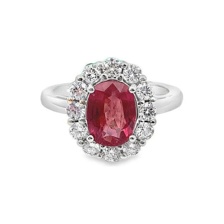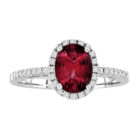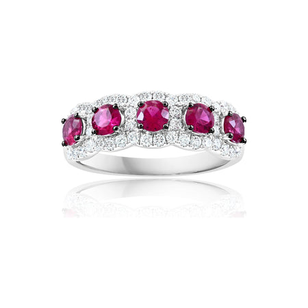 18K White Gold Ruby & Scalloped Diamond Halo Ring